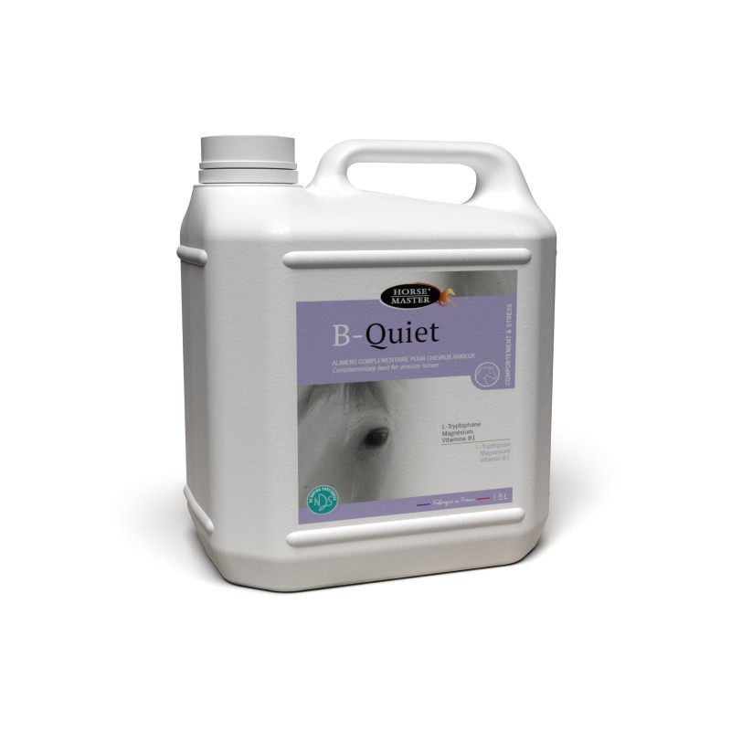 Pour les structures professionnelles ou les propriétaires de plusieurs chevaux, HORSE MASTER décline sa solution B-QUIET en bidon de 5 litres. Cette formule liquide ultra-complète concentre les éléments les plus performants pour le système nerveux. Elle apporte une forte dose de L-Tryptophane, un composant biologique incontournable qui se transforme en sérotonine dans l'organisme, générant un effet relaxant et rassurant. Le magnésium, également présent en quantité, agit comme un myorelaxant naturel. Il apaise l'excitabilité du système nerveux et libère le cheval de ses tensions physiques.