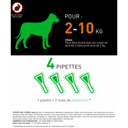 FRONTLINE Combo Chien S est réservé aux chiens et chiots pesant entre 2 et 10 kg, à partir de l'âge de 8 semaines. Une seule pipette de 0,67 ml constitue la dose complète pour cet intervalle de poids. La dose minimale recommandée est de 6,7 mg de fipronil et 6 mg de (S)-méthoprène par kilogramme de poids corporel.