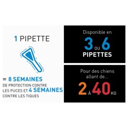 La fréquence de renouvellement recommandée est d'une pipette par mois. Le pack de 6 pipettes offre ainsi six mois de protection continue, un format économique et pratique pour les propriétaires souhaitant ne pas interrompre la protection antiparasitaire de leur chien sur l'ensemble de la saison à risque. Pour les animaux exposés à des infestations intenses ou vivant en extérieur, un contrôle vétérinaire régulier est conseillé.