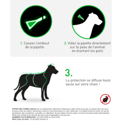 Mode d'application : tenir la pipette verticalement et tapoter légèrement la partie étroite pour s'assurer que le contenu est bien concentré dans la partie large. Casser l'embout présécable d'un geste sec, en direction opposée au visage. Écarter les poils à la base du cou, entre les omoplates, jusqu'à ce que la peau soit distinctement visible. Placer l'embout directement contre la peau et vider intégralement le contenu de la pipette en pressant plusieurs fois, en un seul point. L'application doit être réalisée sur la peau nue, et non sur le pelage, pour assurer une absorption et une diffusion optimales.